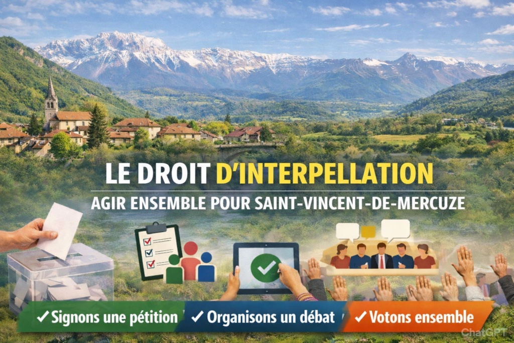 Le droit d’interpellation est le remède au sentiment d’impuissance des citoyens entre deux élections. Pour Saint-Vincent-de-Mercuze, ce serait un saut qualitatif : passer d’une gestion “descendante” (le maire décide seul) à une gestion partenariale.